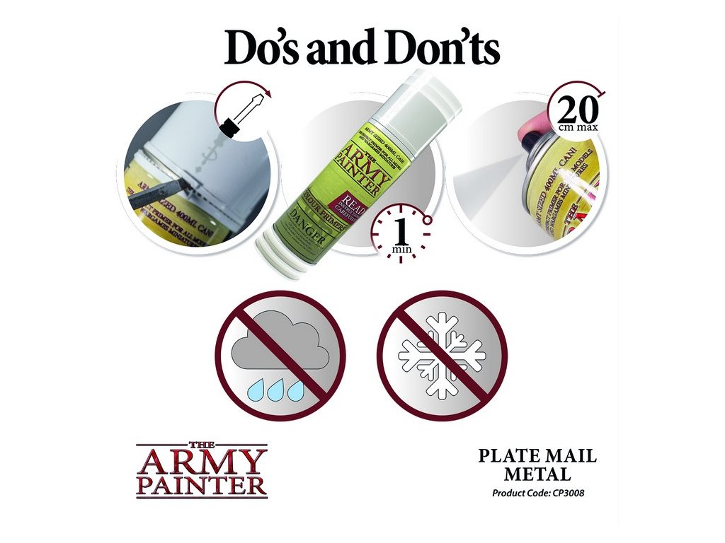 Colour Primer Platemail Metal není jen tak obyčejný primer. Jeho unikátní složení vytváří na povrchu figurky vzhled tvrzené oceli, a přitom si zachovává matný povrch. Díky tomu se další vrstvy akrylových barev dokonale uchytí a vyniknou i ty nejmenší detaily. Zapomeňte na zdlouhavé nanášení základní barvy štětcem – s tímto sprejem je primerování figurek rychlé, snadné a efektivní.