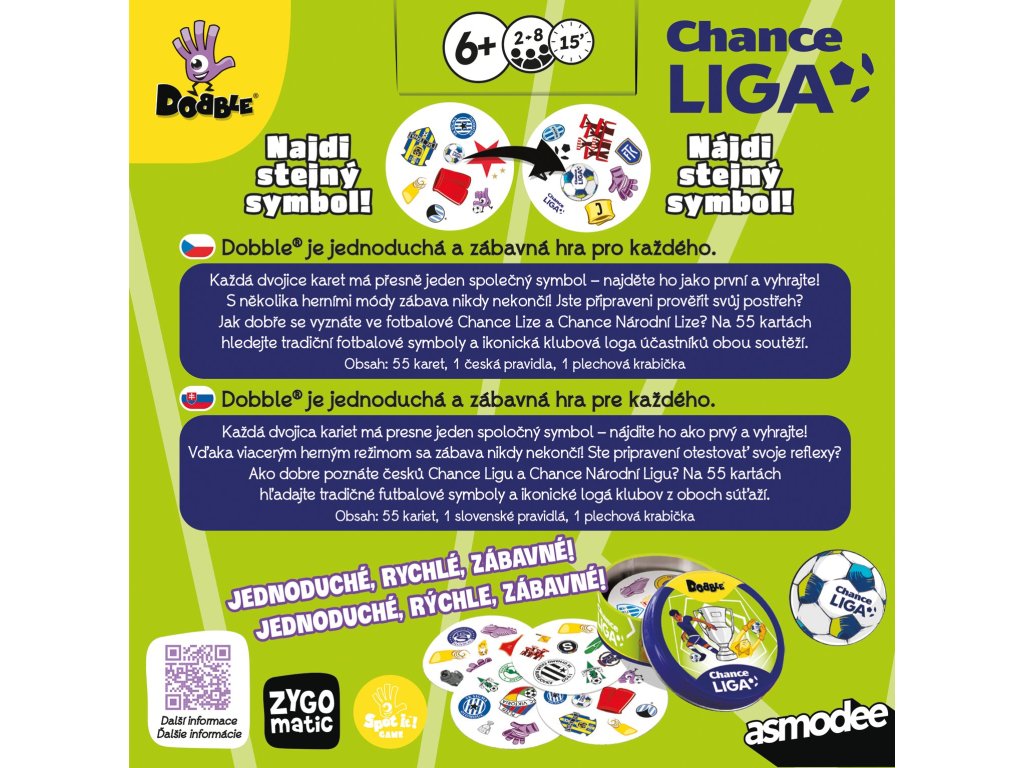 Jde o speciální edici kultovní postřehové hry Dobble, tentokrát oblečenou do dresu české Chance Ligy a Chance Národní Ligy. Na 55 kartách najdete tradiční fotbalové symboly a ikonická loga klubů z obou nejvyšších českých fotbalových soutěží. Princip zůstává stejný jako u klasického Dobble – každá dvojice karet sdílí přesně jeden společný symbol. Kdo ho najde první, bere!