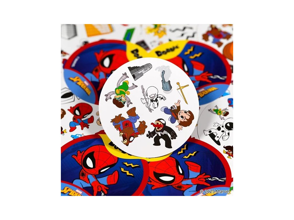 Na 55 krásně ilustrovaných kartách najdete všechny své oblíbené postavy z komiksů Spider-Man – od samotného Spidermana přes zákeřného Venoma až po milou tetu May. Každá karta obsahuje několik symbolů a váš úkol je jednoduchý: buďte nejrychlejší a jako první pojmenujte jediný společný symbol mezi dvěma kartami!