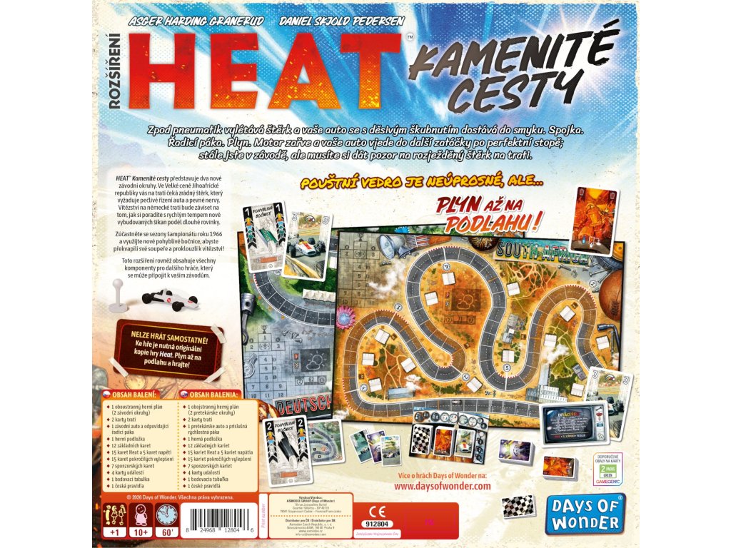 Máte rádi napětí na závodních okruzích a touhu po vítězství? Pak je HEAT: Kamenité cesty přesně tím rozšířením, které posune vaše závody na zcela novou úroveň. Toto třetí rozšíření pro oblíbenou deskovou hru HEAT vás zavede do roku 1966, kdy se závodníci potýkali s náročnými tratěmi plnými štěrku a museli zvládat rychlé šikany s dokonalou přesností.