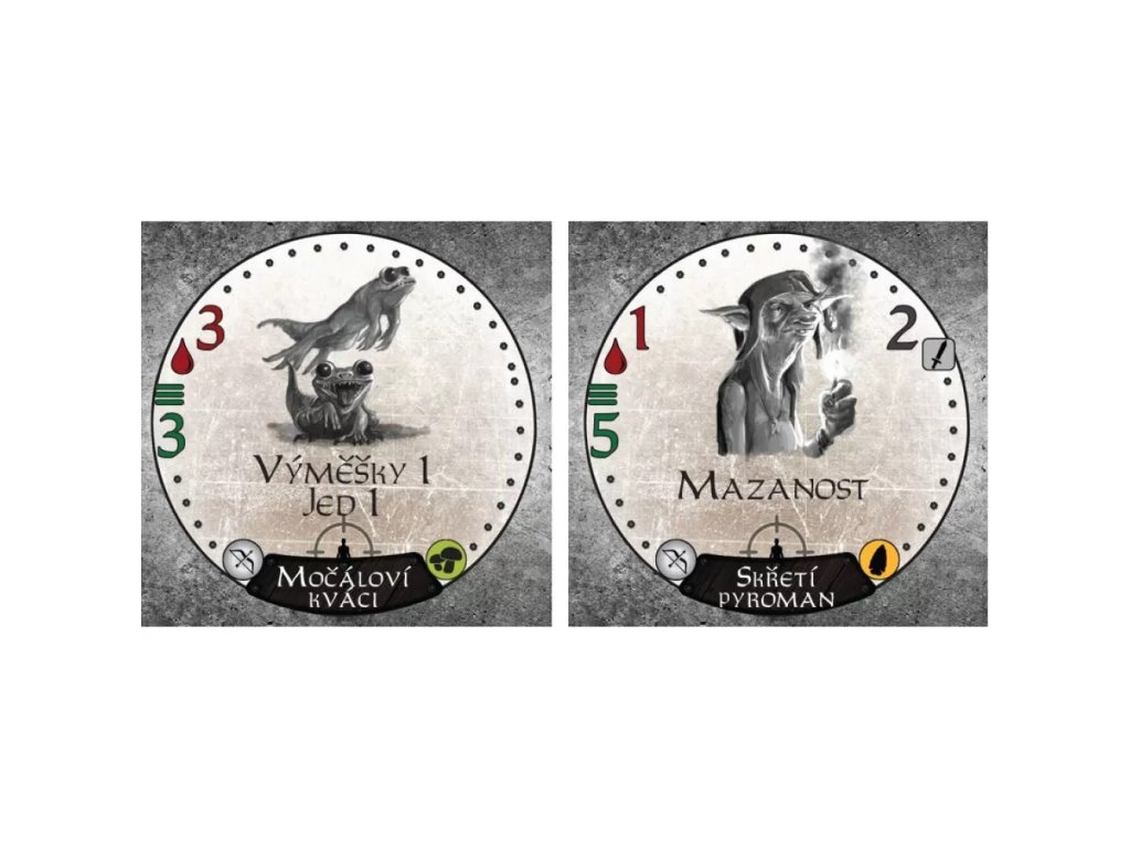 - Obsah: 40 karet střetnutí, 15 karet zlounů, pořadač žetonů, karta nápovědy