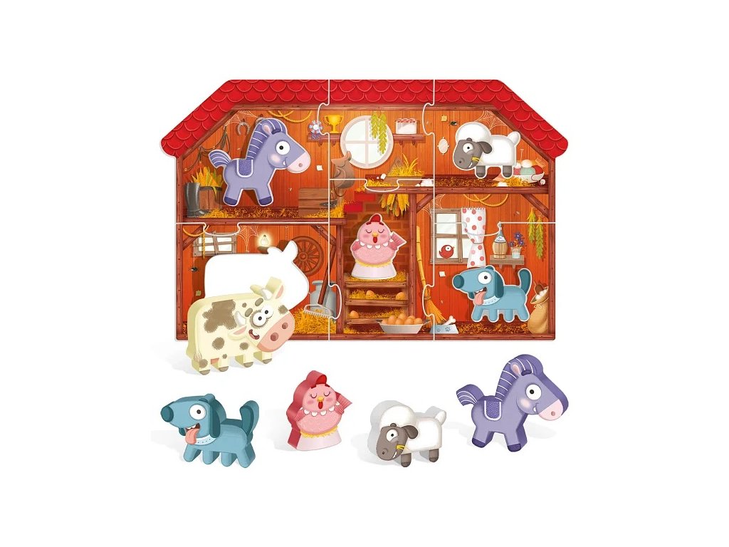 Na první pohled se může zdát, že jde o obyčejné dětské puzzle. Jenže tady dostáváte mnohem víc. Puzzle se skládá ze 6 tvarovaných dílků, které dohromady vytvoří půvabnou stodolu. A to není všechno – součástí balení je také 5 dřevěných zvířátek, která musí děti umístit na správná místa podle jejich tvaru. Tahle kombinace klasického skládání s vkládáním tvarů dělá z puzzle komplexní vzdělávací pomůcku, která stimuluje hmat i logické myšlení.