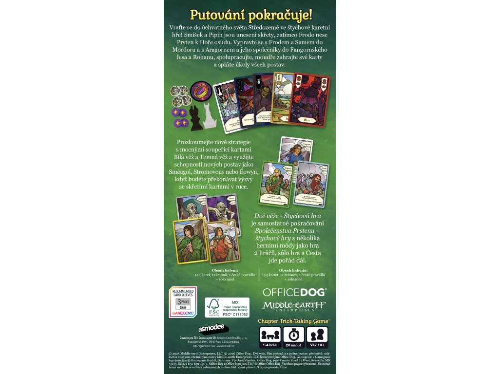 Vydejte se na epické putování pokračováním příběhu, který uchvátil miliony čtenářů a diváků po celém světě. Pán prstenů: Dvě věže - Štychová karetní hra vás vtáhne přímo do děje druhého dílu legendární trilogie, kde budete spolu s Frodem, Samem, Aragornem a dalšími hrdiny čelit nebezpečím Mordoru, Fangornského lesa i Rohanu. Tato kooperativní karetní hra kombinuje klasické štychové mechanismy s unikátními herními prvky, které z každé partie udělají napínavý zážitek plný strategických rozhodnutí.