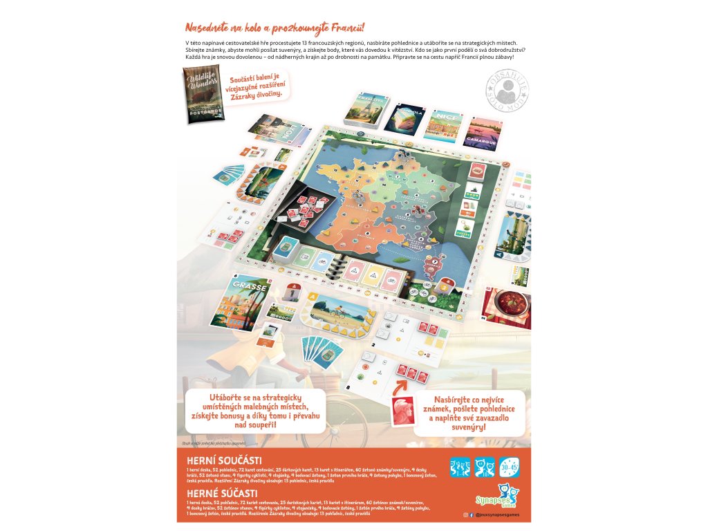 Co všechno v krabici najdete? Hra obsahuje herní desku s mapou Francie, 52 pohlednic, 72 karet cestování, 5 dárkových karet, 13 karet s itinerářem, 60 žetonů známky/suvenýru, 4 desky hráčů, 52 žetonů stanu, 4 figurky cyklistů se stojánky, 4 bodovací žetony, žeton prvního hráče, 4 žetony pohybu, bonusový žeton a samozřejmě česká pravidla.
