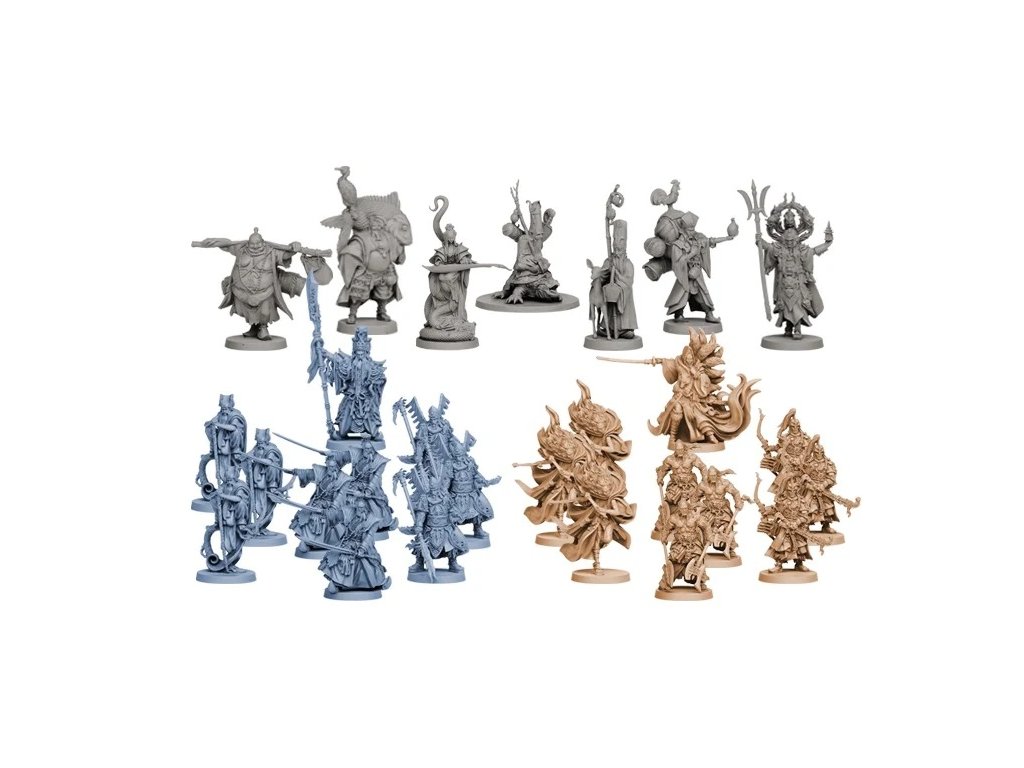 27 figurek, 4 plastové žetony klanů, 22 karet, 22 podstavců, 1 tabulka politiky a války, 10 žetonů, 2 zástěny, 1 pravidla