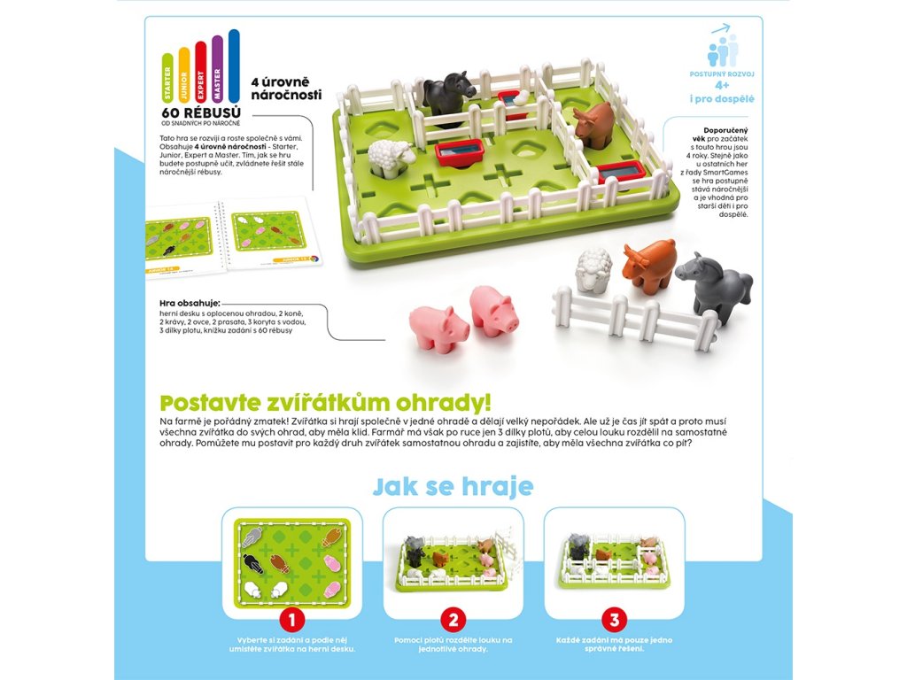 Představte si rozkošnou louku plnou zvířátek – koně, prasátka, ovečky a krávy si vesele hrají pohromadě. Jenže nastal čas jít spát a každé zvířátko potřebuje svůj vlastní klid. Úkolem malého hráče je pomocí pouhých tří dílků plotu rozdělit louku tak, aby každý druh zvířátek měl svou ohradu. A pozor – nesmí se zapomenout ani na napajedla!