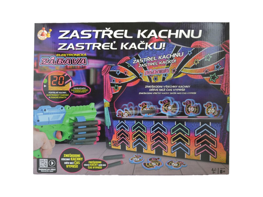 Princip je jednoduchý, ale návykový. Máte 60 sekund na to, abyste sestřelili co nejvíce kachen, které se pohybují po otáčejícím se dopravníkovém pásu. LED časovač jasně ukazuje, kolik času vám ještě zbývá, takže napětí graduje s každou vteřinou. V balení najdete blaster a šipky, takže můžete začít hrát okamžitě po rozbalení.
